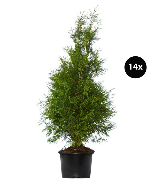 Fragt man Gärtner, welche Heckenpflanze sie schon am häufigsten in Gärten gesetzt haben, lautet die Antwort: Thuja occidentalis. Denn der Lebensbaum ‘Brabant‘ ist in jeder Hinsicht empfehlenswert. Er trägt das ganze Jahr seine frischgrünen Nadeln, stellt kaum Ansprüche an den Standort, ist winterhart und gut frostfest und erfreut außerdem mit seiner enormen Wuchsfreude. Kurz: Wenn Sie auf der Suche nach einer unkomplizierten, immergrünen Heckenpflanze sind, empfehlen wir Ihnen den Lebensbaum ‘Brabant‘. Sie wollen nicht viele Jahre warten, bis die Hecke ausreichend hoch ist? Dann könnte dieses Pflanzenpaket das richtige für Sie sein, denn hier haben wir 14 kräftige Pflanzen zusammengestellt, die bereits eine stattliche Höhe von 150-175 cm haben. Greifen Sie deshalb gleich zu und gönnen sich mit der Thuja occidentalis einen wunderschönen, immergrünen Sicht- und Lärmschutz!