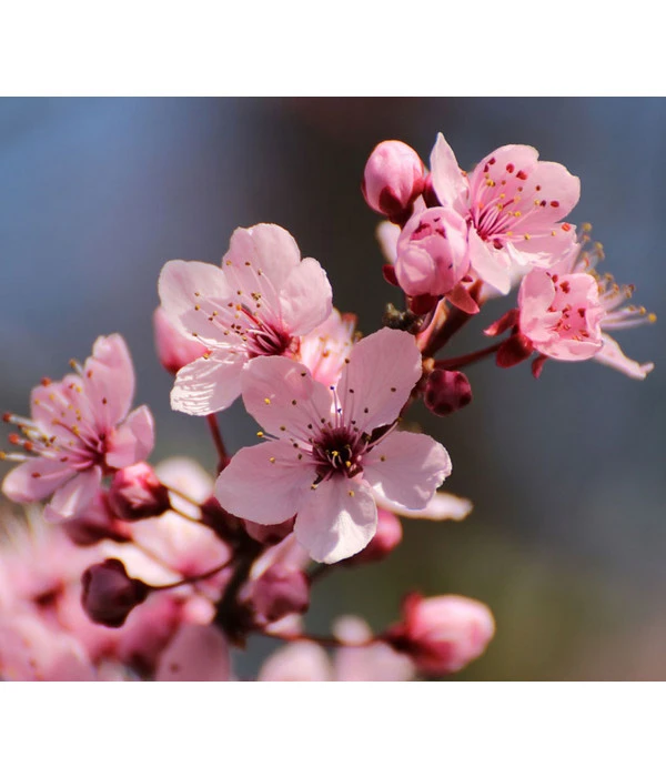 Manche Ziergehölze präsentieren stolz ein dekoratives Blattwerk, andere versuchen mit Blütenreichtum zu beeindrucken – die Blut-Pflaume ‚Nigra‘ aber wurde von der Natur überreich beschenkt und kann sowohl mit bezaubernden rosafarbenen Blüten wie auch mit einem außergewöhnlich dunkelroten Laub Ihren Garten bereichern. Was viele Gärtner ebenfalls an dem Ziergehölz schätzen: Die Blut-Pflaume ‚Nigra‘ blüht bereits im April und entfaltet ihre Blüten noch vor dem Laubaustrieb. Besonders schöne Momente aber werden Sie erleben, wenn der Baum noch blüht, während sich die ersten dunkelroten, glänzenden Blätter auf den dunkelbraun-schwarzen Trieben zeigen und sich alles zu einem eleganten Potpourri aus Rot-, Rosa- und Brauntönen vereint, die die Blut-Pflaume ‚Nigra‘ zu einem der schönsten Ziergehölze machen. Verzichten Sie nicht auf dieses edle Schmuckstück und suchen gleich einen Logenplatz für die Blut-Pflaume ‚Nigra‘ in Ihrem Garten. Doch das Ziergehölz hat noch eine Überraschung für Sie: Bis zum Spätsommer haben sich nämlich aus den Blüten kleine, dunkelrote Früchte entwickelt, von denen Sie sogar kosten dürfen, denn sie sind nicht giftig, sondern wunderbar süß sind.
