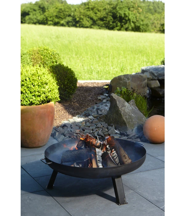 Eine Feuerstelle wie diese hier ist eine Anschaffung fürs Leben. Denn sie ist aus massivem Stahl gefertigt, so dass sie praktisch unzerstörbar ist. Die drei Füße sorgen für einen sicheren Stand und einen ausreichenden Abstand zum Boden. Und mit den beiden Griffen können Sie die Feuerschale auch bequem an einen anderen Ort im Garten tragen. Noch ein Tipp: Am besten stellen Sie die Feuerstelle auf ein Bett aus Kies oder anderem nicht brennbaren Material. Es empfiehlt sich die Feuerschale bei Regen trocken zu lagern, um Rost zu vermeiden.