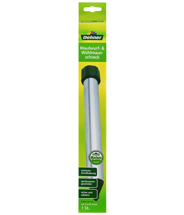 Zur effektiven Nutzung des Dehner Maulwurf- und Wühlmausschrecks stecken Sie das spitze Ende einfach so weit in die Erde, bis das Maulwurfabwehrgerät fest sitzt. Den Rest erledigt der Maulwurfschreck. Dabei sorgt die Kombination der Materialien Metall und Kunststoff für eine hohe Stabilität und Wetterfestigkeit. Mit einer Höhe von 41,4 cm bleibt der Dehner Maulwurf- und Wühlmausschreck so gut sichtbar, dass er nicht als Stolperfalle dient, stört dabei jedoch das Erscheinungsbild Ihres Gartens nicht. Diese Gründe machen den Kauf des Dehner Markenqualitätsprodukts unverzichtbar!