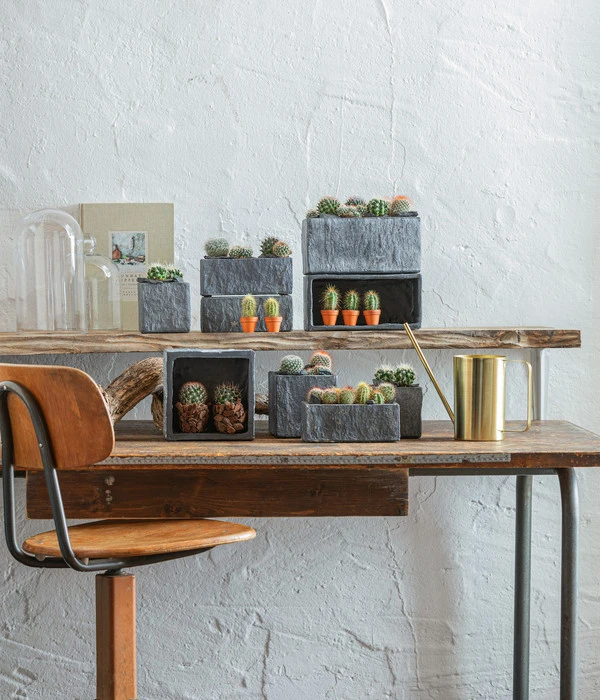Jardinieren haben eine lange Tradition als Blumenbehälter und gehörten im 19. Jahrhundert zum Inventar jeder großbürgerlichen Wohnung. In den letzten Jahrzehnten hatten sie aber an Popularität deutlich verloren. Bis sich seit einiger Zeit Jardinieren in schlichten Formen und modernen Materialien ihren Platz in den Gärten, auf den Balkonen und in den Wohnräumen zurückerobern. Wie diese Jardiniere Slate in Steinoptik. Mit ihren früher oft üppig verzierten Vorgängern aus Keramik oder Porzellan hat diese Jardiniere in Steinoptik nicht mehr viel gemeinsam. Sie zeigt noch die längliche Form, setzt aber konsequent auf gerade Linien und Kanten – ein sehr schlichtes und zeitlos schönes Design-Konzept. Die zweite Besonderheit ist die rustikale Oberfläche, die wirkt, als hätte ein Steinmetz die Jardiniere aus einem Naturstein gehauen. Die Jardiniere Slate ist zwar tatsächlich von Hand gefertigt, allerdings nicht aus Naturstein, sondern aus dem zeitgemäßen Material Sand-Zement. Und da bei jedem Blumenkasten in Steinoptik die Oberfläche ein bisschen anders ausfällt, ist jeder ein unverwechselbares Unikat.