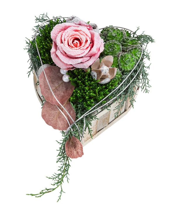Mit einem Grabschmuck möchten wir aber natürlich auch eine Botschaft an unsere geliebten Verstorbenen senden und dafür haben die Floristen hier die Rose gewählt. Die rosa Rose symbolisiert auch Dankbarkeit, eine schöne Geste also für die letzte Ruhestätte. Begleitet wird die Kunstblüte in dem Trauergesteck Im Himmel von Eukalyptus-Glocken, frischer Hebe ‚Green Globe‘ und immergrünem Hauswurz, die einen eindrucksvollen Farbkontrast zu dem Zartrosa der Blüte bilden. Dank der Holzschale können Sie das Gesteck im Handumdrehen umstellen oder mitnehmen und die Materialien sorgen dafür, dass es auch lange nach Allerheiligen ansehnlich bleibt.