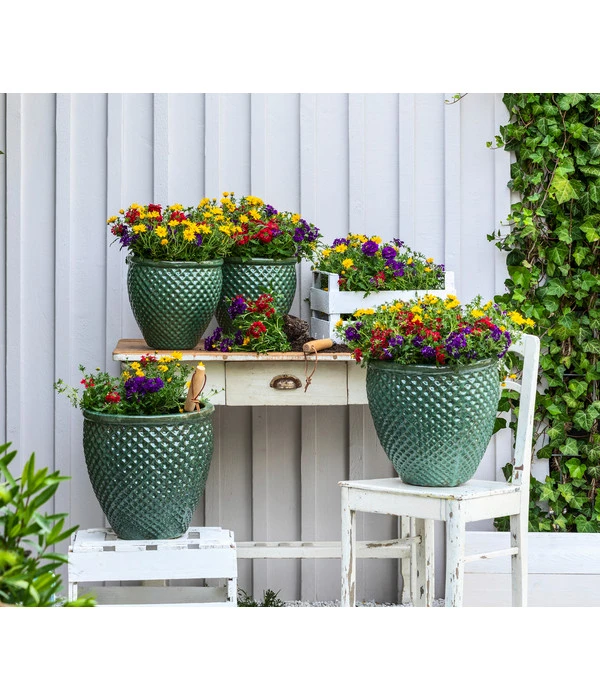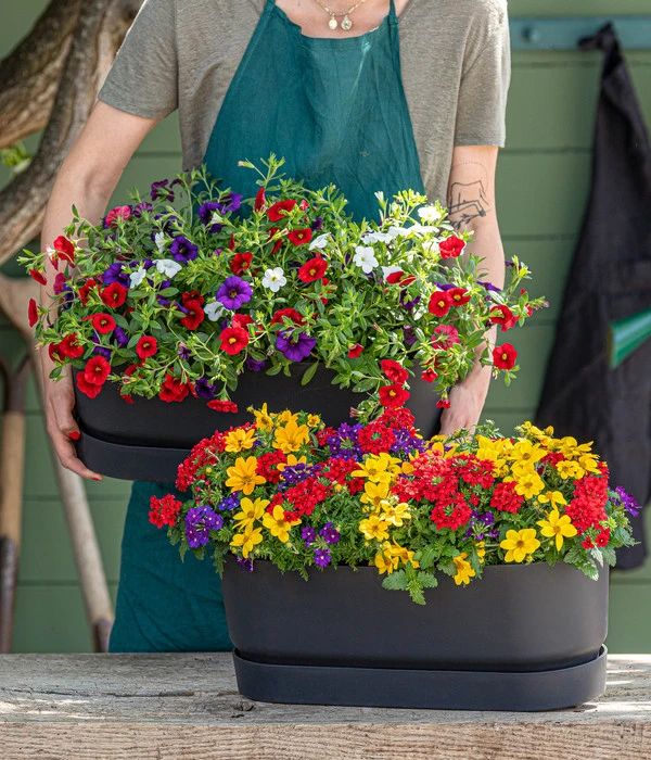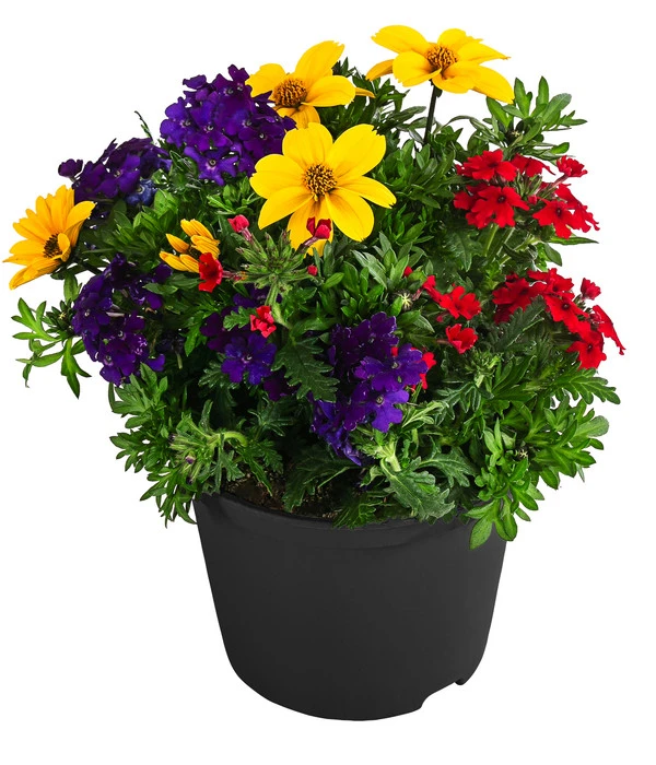 Blau wie der Himmel an einem schönen Sommertag, gelb wie der strahlende Sonnenschein und dazu ein Rot, das vor Dynamik und Lebensfreude pulsiert: das Sommerblumen-Trio ist ein gelungener Mix aus den schönsten Farben des Sommers. Und was den Dekorationseffekt noch erhöht: Es handelt sich nicht um eine einzige Blumenart, die in drei Farben blüht. Vielmehr haben sich hier zwei wunderschöne Sommerblumenarten zusammen gefunden, die sich jeweils mit einer anderen Blütenform schmückt. Und wie sich das für eine Gruppe gehört, die für mindestens eine ganze Saison ihre Fans erfreuen will: Bei der Zusammenstellung wurde darauf geachtet, dass die Goldmarie und die Verbenen ungeachtet ihrer unterschiedlichen Optik perfekt miteinander harmonieren und auch die gleichen Wünsche und Vorstellungen bezüglich Standort und Pflege haben.