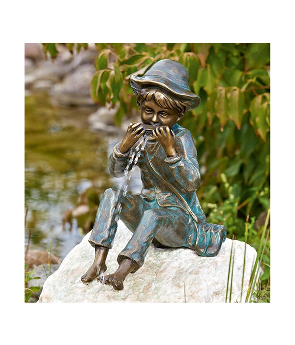 Wäre es nicht schön, wenn Ihnen dieser nette kleine Kerl an Ihrem Gartenteich Gesellschaft leisten würde? Er hat immer Zeit für Sie, sitzt auf einem Stein und unterhält Sie mit seiner Wassermusik. Die Rottenecker Bronzefigur Junge Til mit Mundharmonika ist in der Tat ein entzückendes Bronzekunstwerk, das jeden mit seiner liebenswürdigen Ausstrahlung anspricht. Jedes feine Detail der Rottenecker Bronzefigur Junge Til mit Mundharmonika zeugt von der Vollkommenheit des künstlerischen Entwurfs, die meisterliche Ausführung steht dem in nichts nach, sondern bringt die Schönheit des Bronzekunstwerks erst richtig zur Geltung. Für die Wasserspeier-Funktion hat die Rottenecker Bronzefigur Junge Til mit Mundharmonika im Inneren eine Kupferrohr-Steigleitung. Die Bronzefigur Junge Til mit Mundharmonika ist frostfest, vor dem Wintereinbruch sollten Sie aber das Wasser aus der Leitung und dem Becken entfernen.