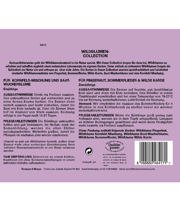 Die Firma Thompson & Morgan wurde bereits im Jahre 1855 gegründet und gilt als echter Experte für englische Blumensorten und Samen – mittlerweile erfreut sich das Sortiment auch in Deutschland einer großen Beliebtheit. Innerhalb der Entwicklung und Produktion gelten strenge Richtlinien, dank derer Sie sich auch über die einwandfreie Qualität der Thompson & Morgan Samen ‚Wildblumen-Collection‘ sicher sein können.