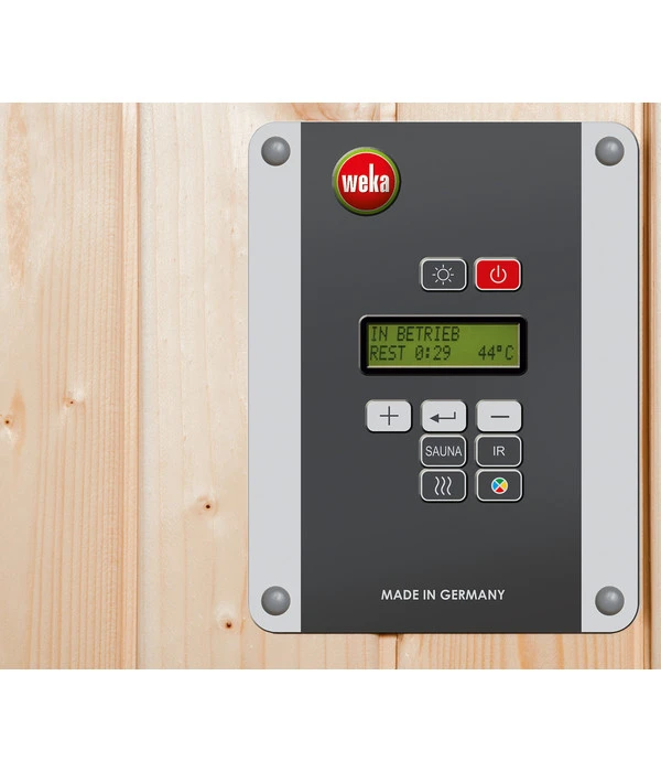 Spezielle Infrarotstrahler sind bei Infrarotkabinen das A und O. Bei der Weka Infrarotkabine Tanilla verbreiten 4 hochwertige Keramikstrahler die spezielle Wärme, die nicht nur die Luft erwärmt, sondern auch durch die Haut in die stärker durchbluteten Hautschichten eindringt, sodass sich die Wärme besonders gut im Blutkreislauf verteilen kann. Sie werden dabei von Innen gewärmt und schon nach kurzer Zeit ins Schwitzen kommen. Die Keramikstrahler haben ein Temperaturspektrum zwischen 30 und 70°C, aus dem Sie Ihre persönliche Wohlfühltemperatur wählen können. Bedient werden die Infrarotstrahler mittels einer modernen, multifunktionalen Steuerung mit Digitalanzeige.