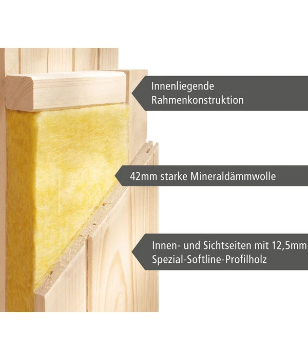Sie lieben diesen typischen Holzduft in einer heißen Saunakabine? Dann werden Sie auf dieses Entspannungsmoment nicht verzichten müssen, denn die Wände der Wolff Finnhaus Innensauna de luxe Helia bestehen aus einer stabilen Rahmenkonstruktion aus Nordischer Fichte mit einer Schicht aus 42 mm Mineraldämmwolle, um die Hitze in der Saunakabine zu halten; auch die Decke ist mit Mineralwolle gedämmt. Die beiden Saunabänke sind aus massivem Espenholz, das eine besonders feine, glatte Oberfläche hat, gut zu reinigen ist und nicht unangenehm heiß wird. Die bronzierte Ganzglastür aus Einscheibensicherheitsglas lässt viel Licht ins Saunainnere und lockert die Holzfront optisch aus. Außen hat die Glastür einen modernen Edelstahlgriff, innen wegen der Hitze einen Holzgriff. Der Dachkranz mit dem LED-Strahlerset mit 3 frei positionierbaren 7,5 Watt-Strahlern macht die einladende Ausstrahlung dieser Sauna perfekt.